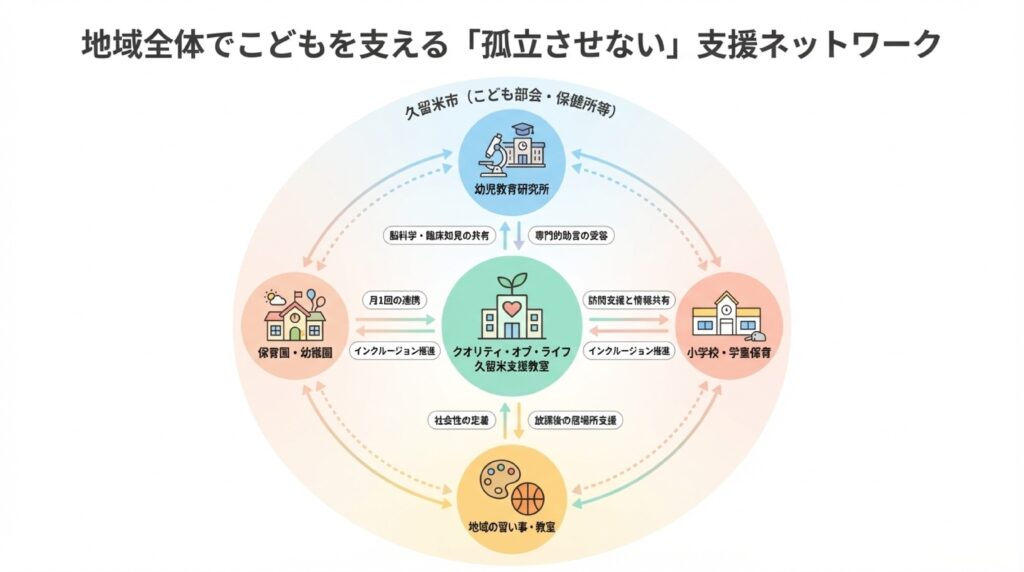 私たちは、行政、教育、専門機関と手を取り合う「地域連携」を大切にしています。情報共有と相互理解を深めることで、こどもたちがどこにいても適切なサポートを受けられる環境づくりを目指しています。