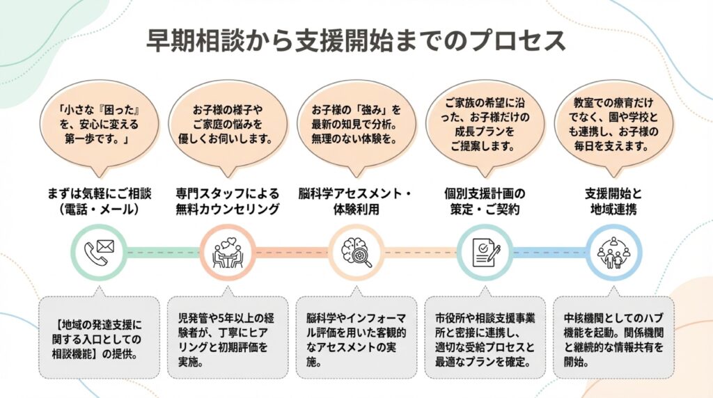 「ちょっと気になる」という最初の不安から、実際の支援開始、そしてその後のフォローまで。ご家族の心に寄り添い、スムーズで安心できるプロセスを構築しています。
