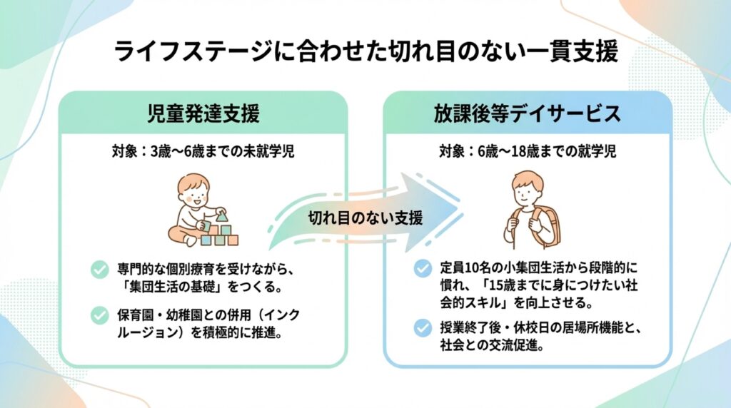 主に6歳から18歳の児童を対象として、学校の授業終了後や休校日に通う療育機能・居場所機能を備えた福祉サービスです。事業所ごとに特色があり、生活能力向上の訓練や社会との交流促進などの継続的な支援を目的としています。利用児童は通所受給者証の交付を受けることで、自己負担が少なく利用可能です。